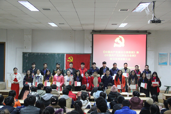 首先召开的是新党员入党宣誓大会。鲜红的党旗,醒目的主题横幅,庄严肃穆的现场气氛。在雄壮的《国际歌》结束后,宣誓仪式正式开始。此次仪式由曾竞兴主持,并带领预备党员宣读誓词。现场响起阵阵激昂的宣誓声,面对着党旗,大家接受了一次身心的洗礼。随后,易贵元上台讲话。他在会议上说道:“我们要听从习总书记的指示,从严治党,要明确党员身份、严格要求自己……”紧接着,特邀嘉宾何立强上台讲话,他首先表达了对新党员的欢迎和祝贺,同时从思想上、工作上、学习上三个方面对新党员做出了要求和规划。之后,新老党员代表分别上台讲话,发表了自己对党的看法、想法,同时郑重承诺一定要向优秀党员看齐,做党员该做的事、说党员该说的话,以表实事求是、虚心学习、追求进步的决心。