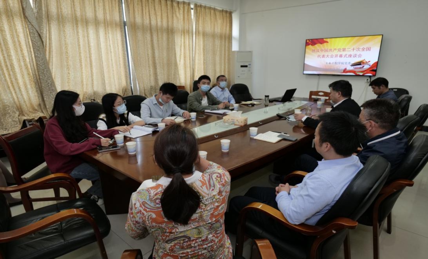 院党委及领导班子、科研代表、教师代表及学生代表在土木楼201办公室集中观看二十大直播