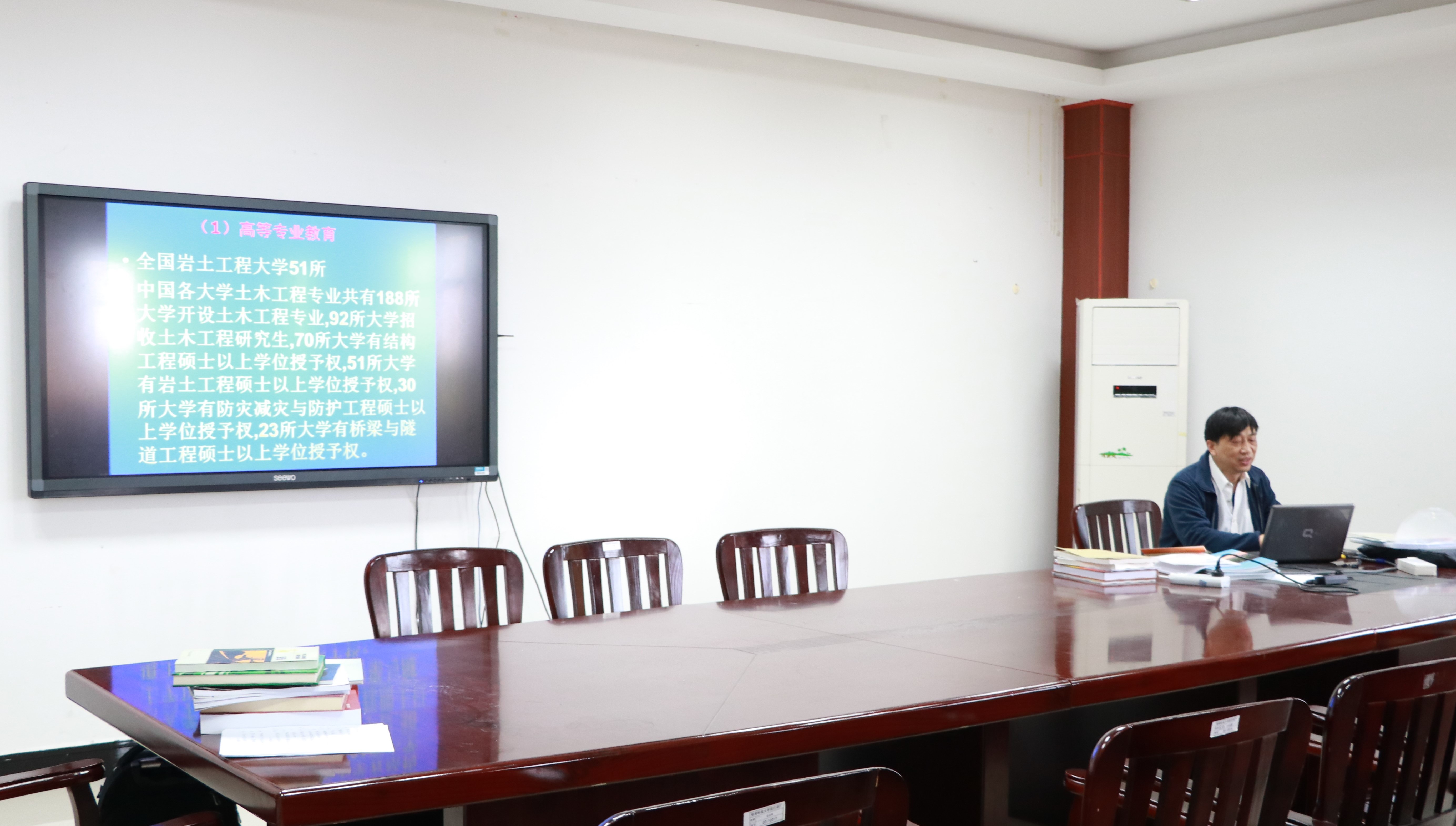 会议在陈书记介绍完来宾后正式开始。首先,龙志阳研究员对矿山建设与岩土工程专业的主要学习课程与主要分配去向进行了简单介绍。接着,龙志阳研究员从博览知识研究问题、领悟指南申报课题、缜密方案稳妥实施、全面总结鉴定报奖、撰写论文成才立业五个方面介绍了本次报告的主题。其中,龙志阳研究员在介绍研究问题的方式时给出了参加学术会议、参观各类设备展览、提出研究问题等建议。在谈到撰写论文成才立业时,龙志阳研究员从论文撰写技巧、论文投稿期刊范围、申报各种人才奖励、近况成为行业专家等方面给出了详细的建议。最后,龙志阳研究员在回答老师以及学生们提出的问题时也提到了岩土工程专业的美好前景。